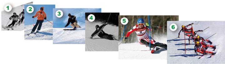 - Virage coupé type GS : le vrai virage coupé de compétition (dans les 3 phases du virage, maîtrise de l'inclinaison, de l'angulation, des équilibres avant/arrière, des rotations, des répartitions de pression ski intérieur et extérieur, de l'accélération du ski)